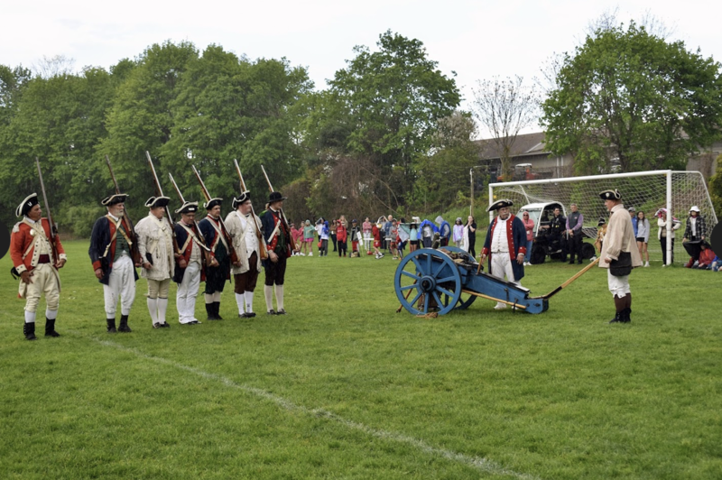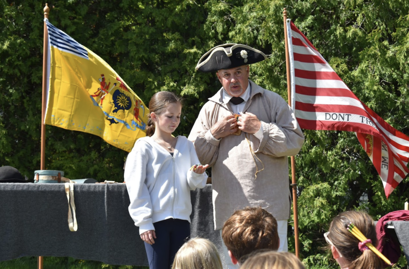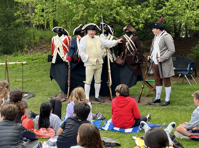 At the end of the event, the fifth-graders were brought outside to watch the re-enactors debate on whether to join George Washington’s army headed to defend New York City in 1776, to learn about marching in formation, and to witness the firing of muskets.